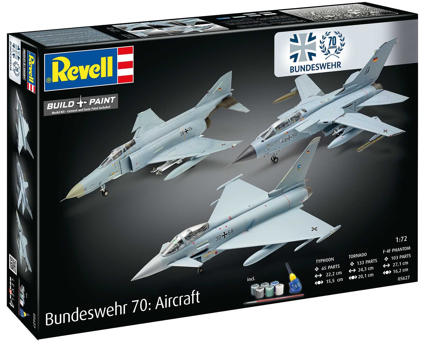 Dárková sada "70 let Bundeswehru" byla speciálně vyvinuta tak, aby vám co nejvíce zpříjemnila modelářské zážitky. Ať už jste začátečník, nebo zkušený stavitel modelů, s přiloženými základními barvami, lepidlem a štětcem máte vše, co potřebujete do začátku. Letouny Eurofighter Typhoon, Phantom a Tornado patří k nejznámějším modelům moderní Luftwaffe a představují důležité milníky v německé vojenské historii.