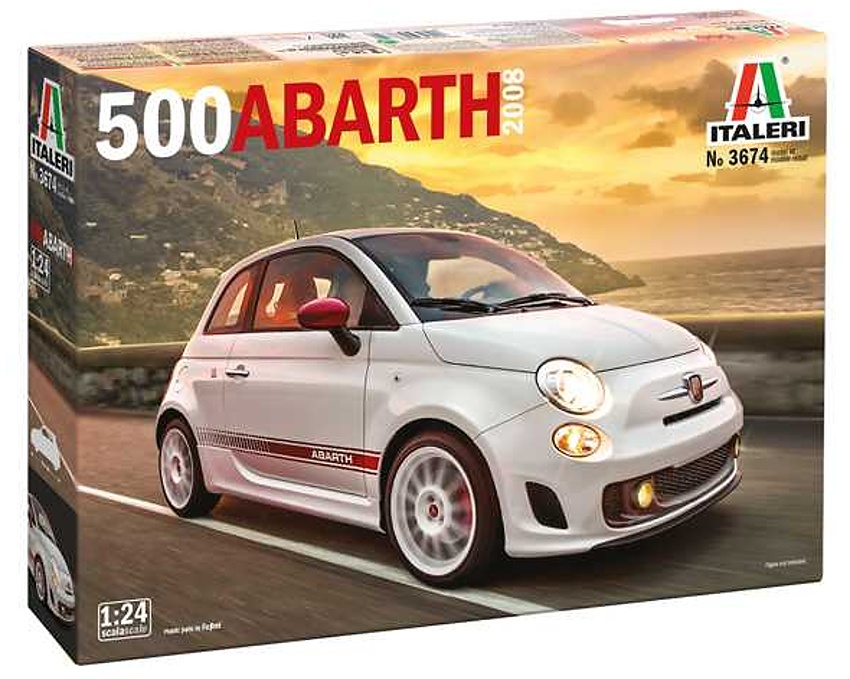 Model auta Fiat 500 Abarth (2008) ke slepení. Měřítko: 1:24; Velikost: 15,2 cm. Obtížnost: 3.