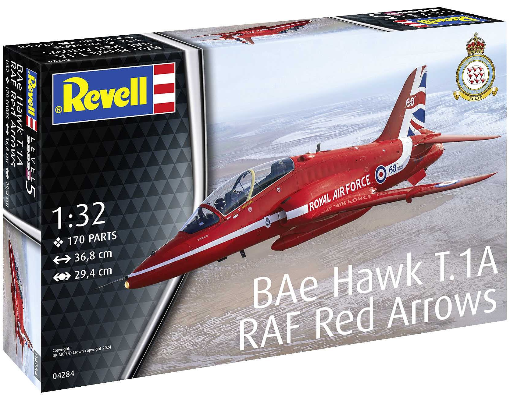 Model britského cvičného proudového letounu BAe Hawk T.1A z britské akrobatické skupiny Red Arrows ke slepení. Měřítko: 1:32; Velikost: 36,8 cm. Balení obsahuje: 170 dílků ke slepení.